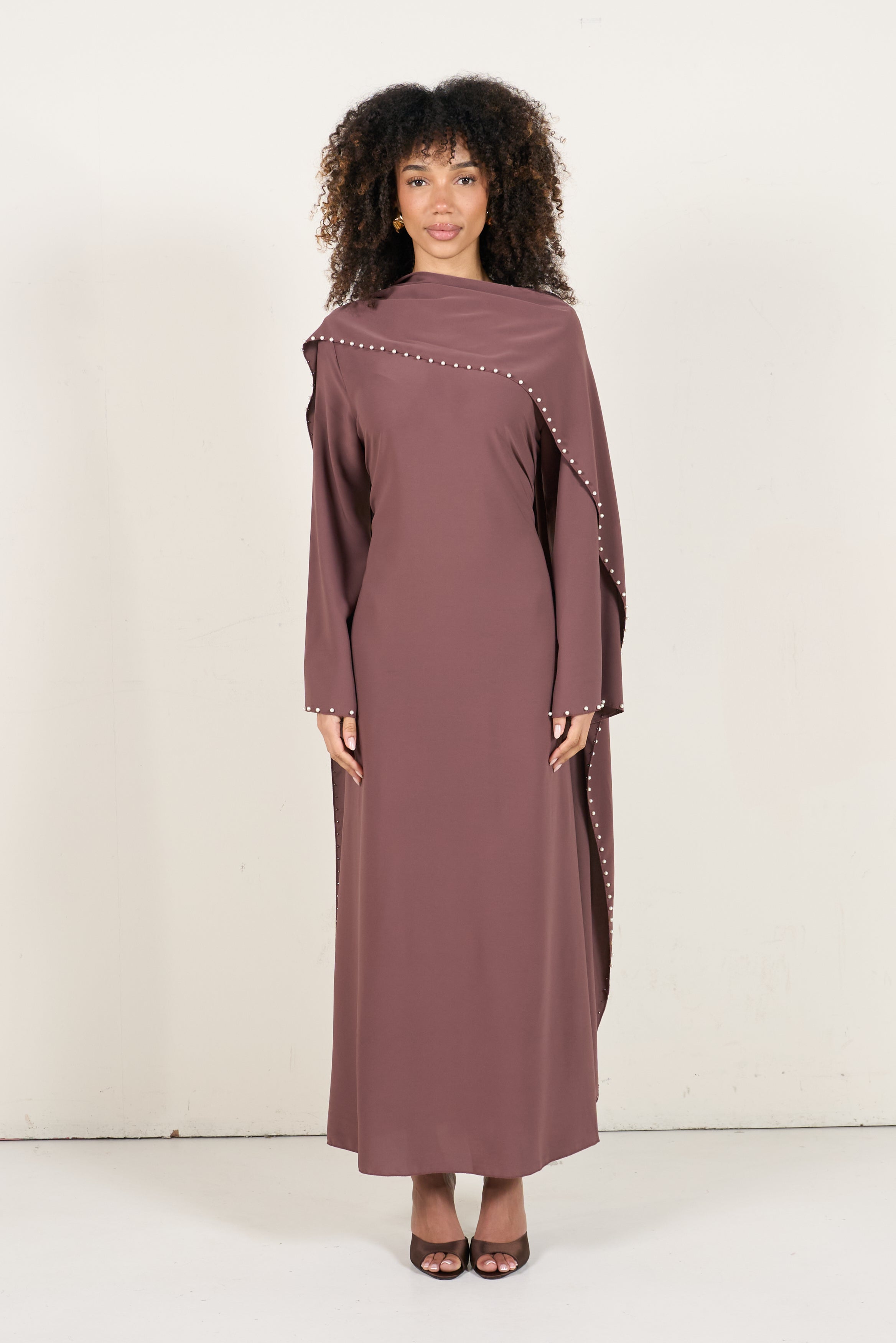 This dusty rose pearl dress with cape features a flowing maxi silhouette and an elegant cape finished with delicate pearl details. The design offers a refined and timeless look, making it suitable for formal events, weddings and special occasions.