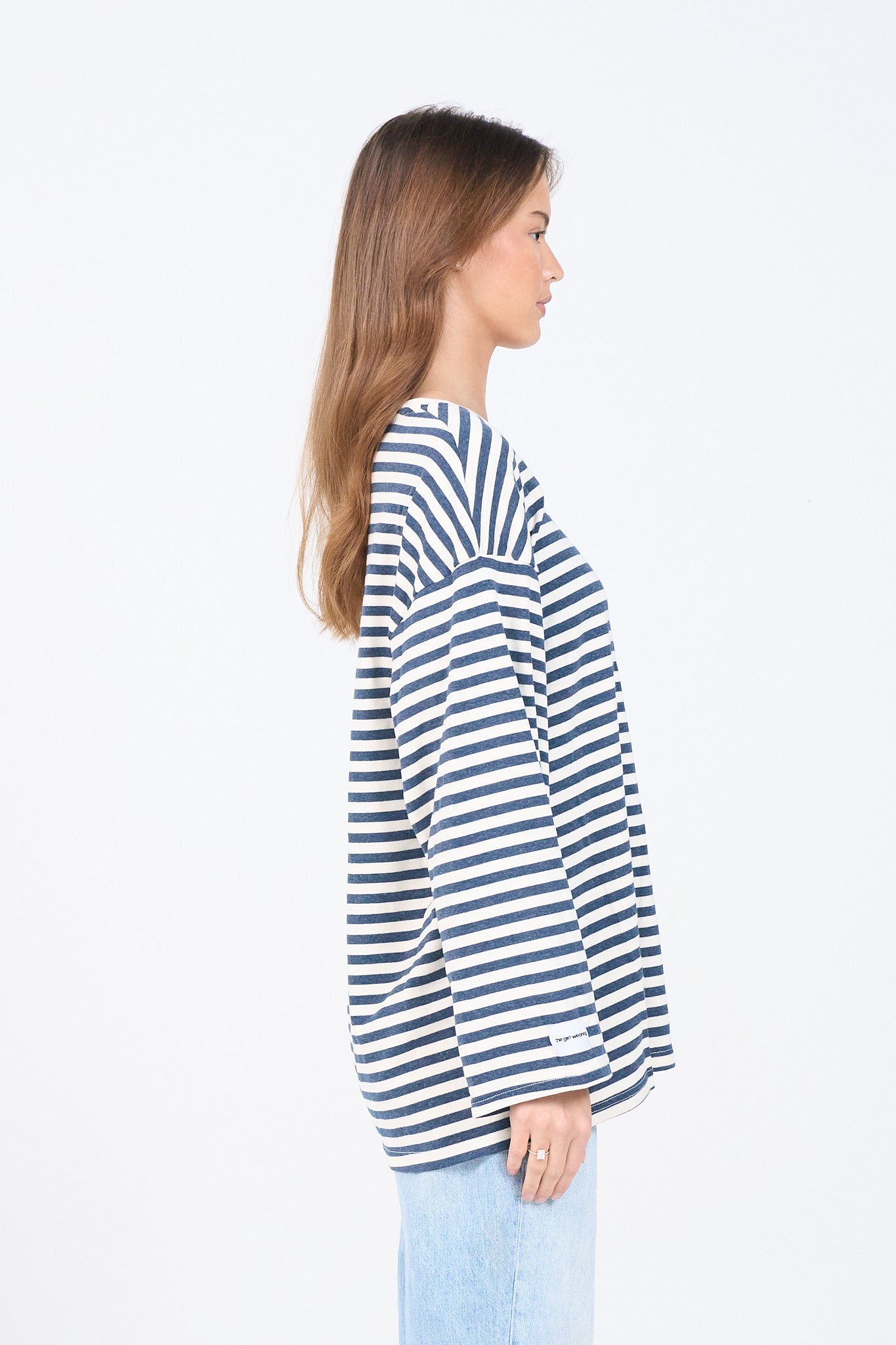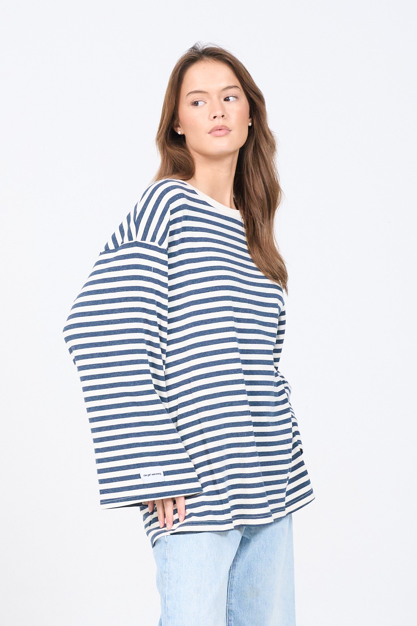 This long sleeve striped T-shirt adds a cozy and casual touch to any outfit. Made from soft cotton with a hint of polyester, it’s breathable and comfortable for everyday wear. The slightly oversized fit and relaxed silhouette make it perfect for layering or wearing on its own.