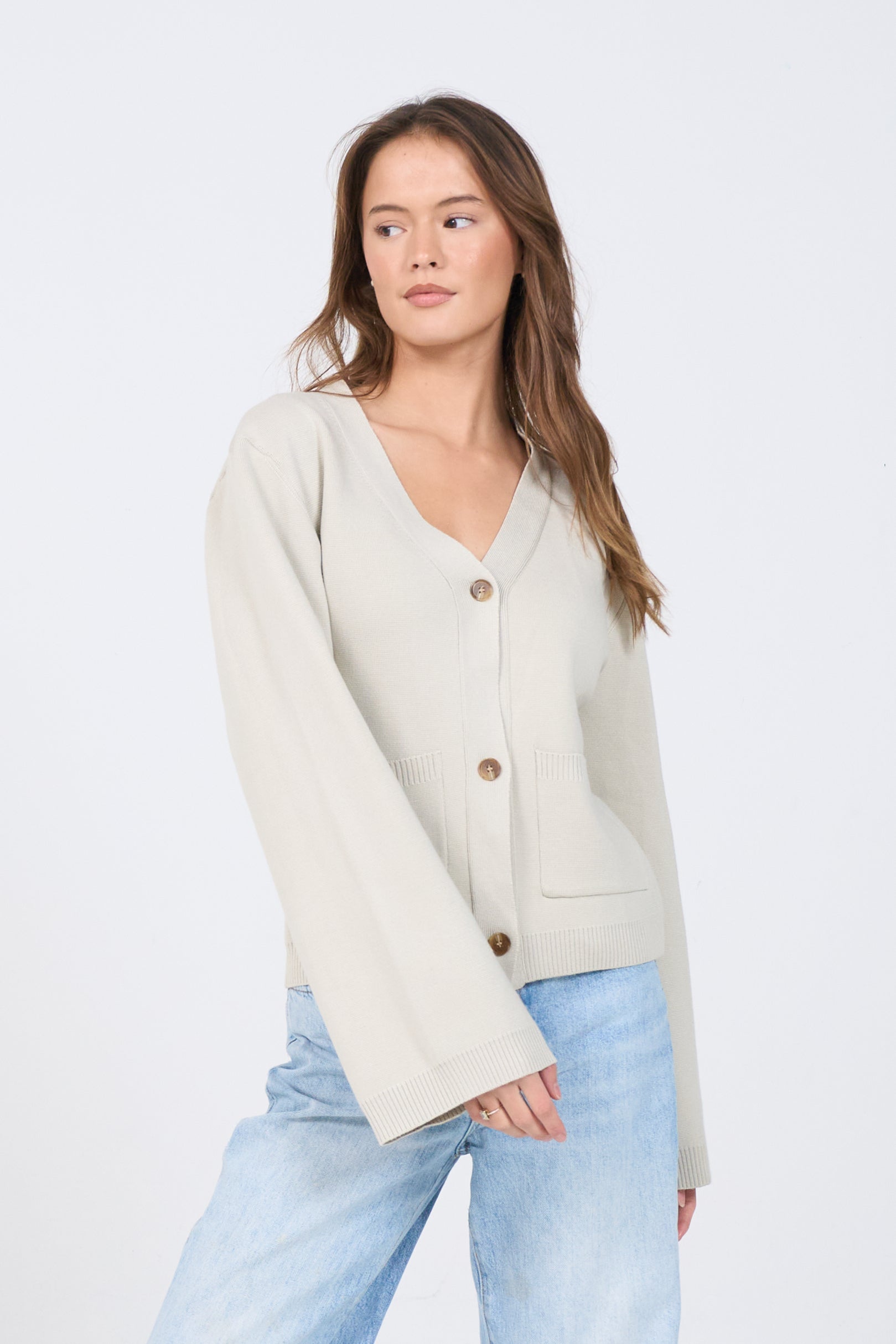 Elevate your everyday style with this beige knit cardigan — the perfect balance of comfort and timeless design. Featuring a flattering V-neckline, front button closure, and two practical pockets, this cardigan adds effortless elegance to any outfit.