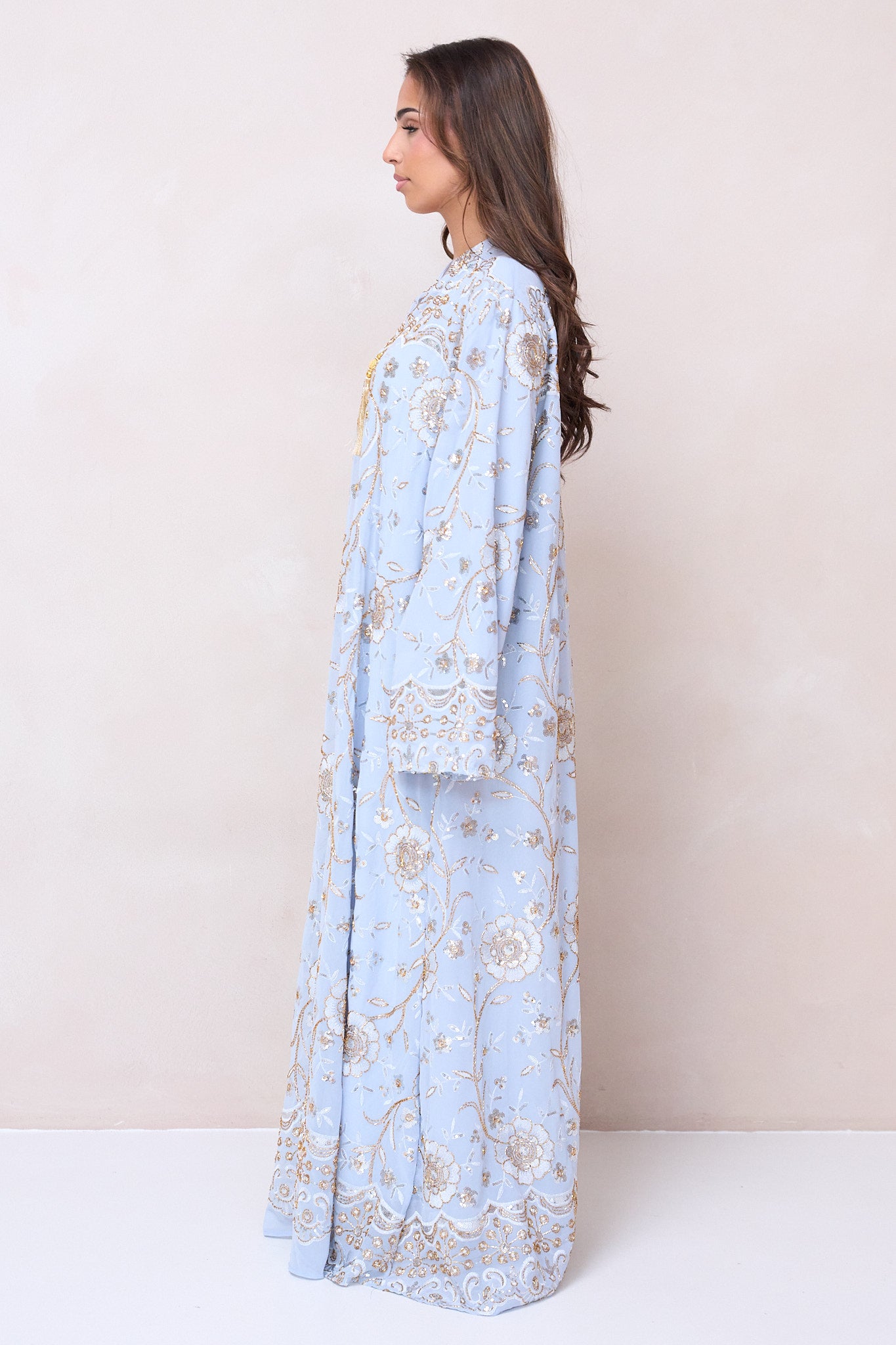 The Sultana Gold Abaya drapes beautifully, creating a graceful silhouette with a soft, sophisticated flow. The gold detailing adds a premium touch that instantly upgrades your outfit, even when styled minimally.