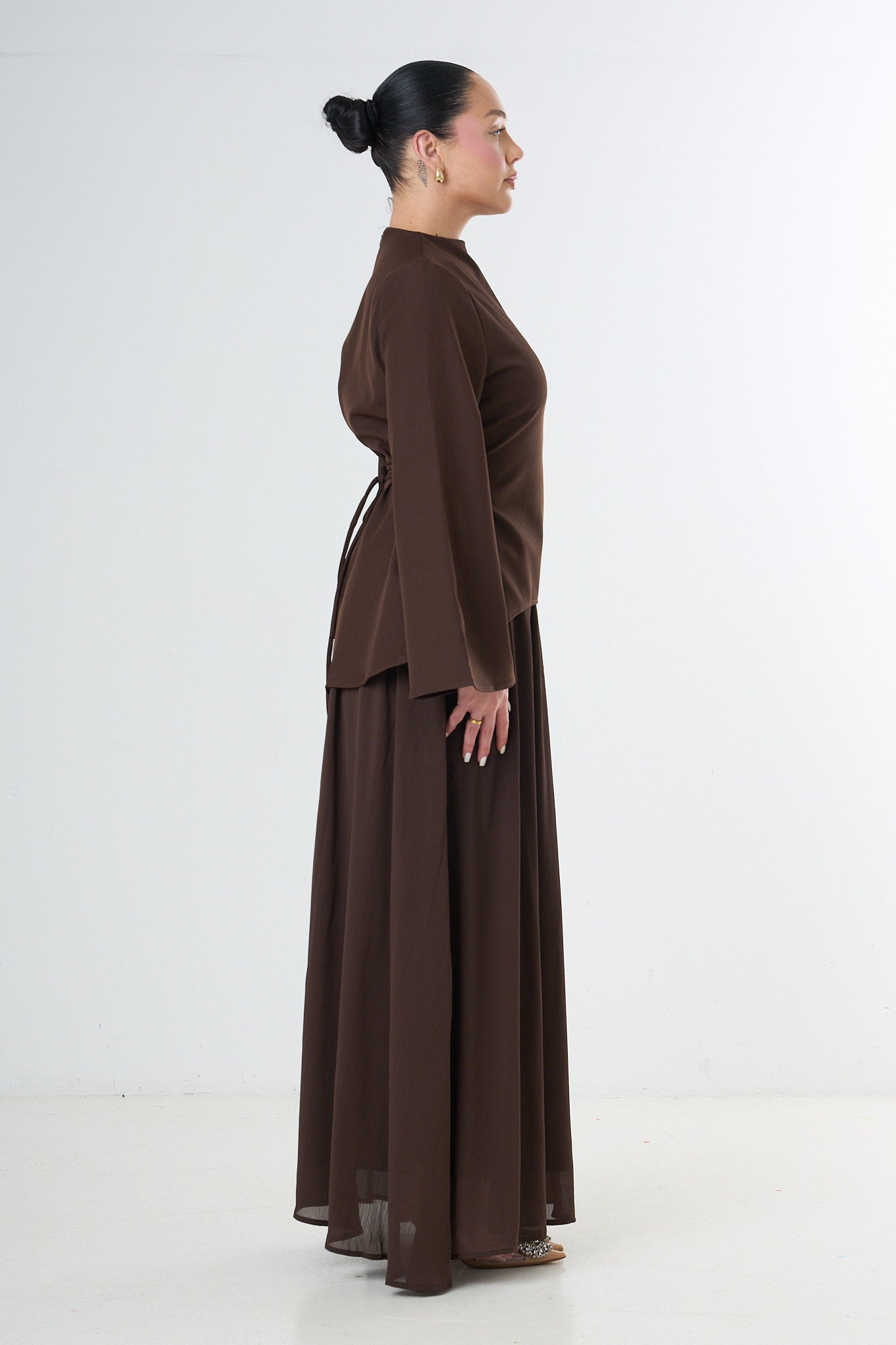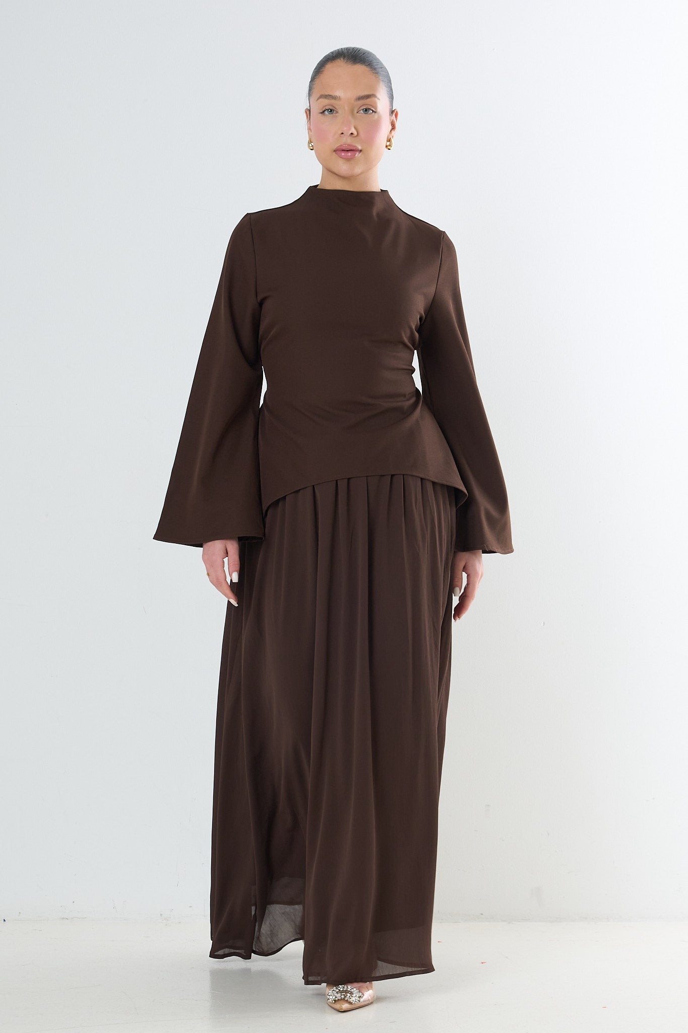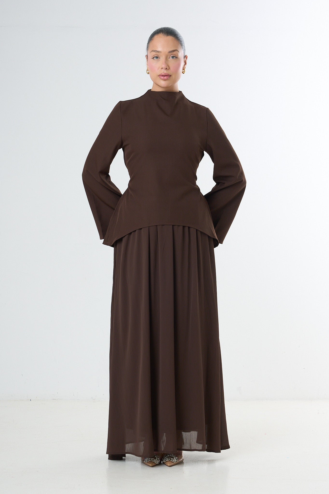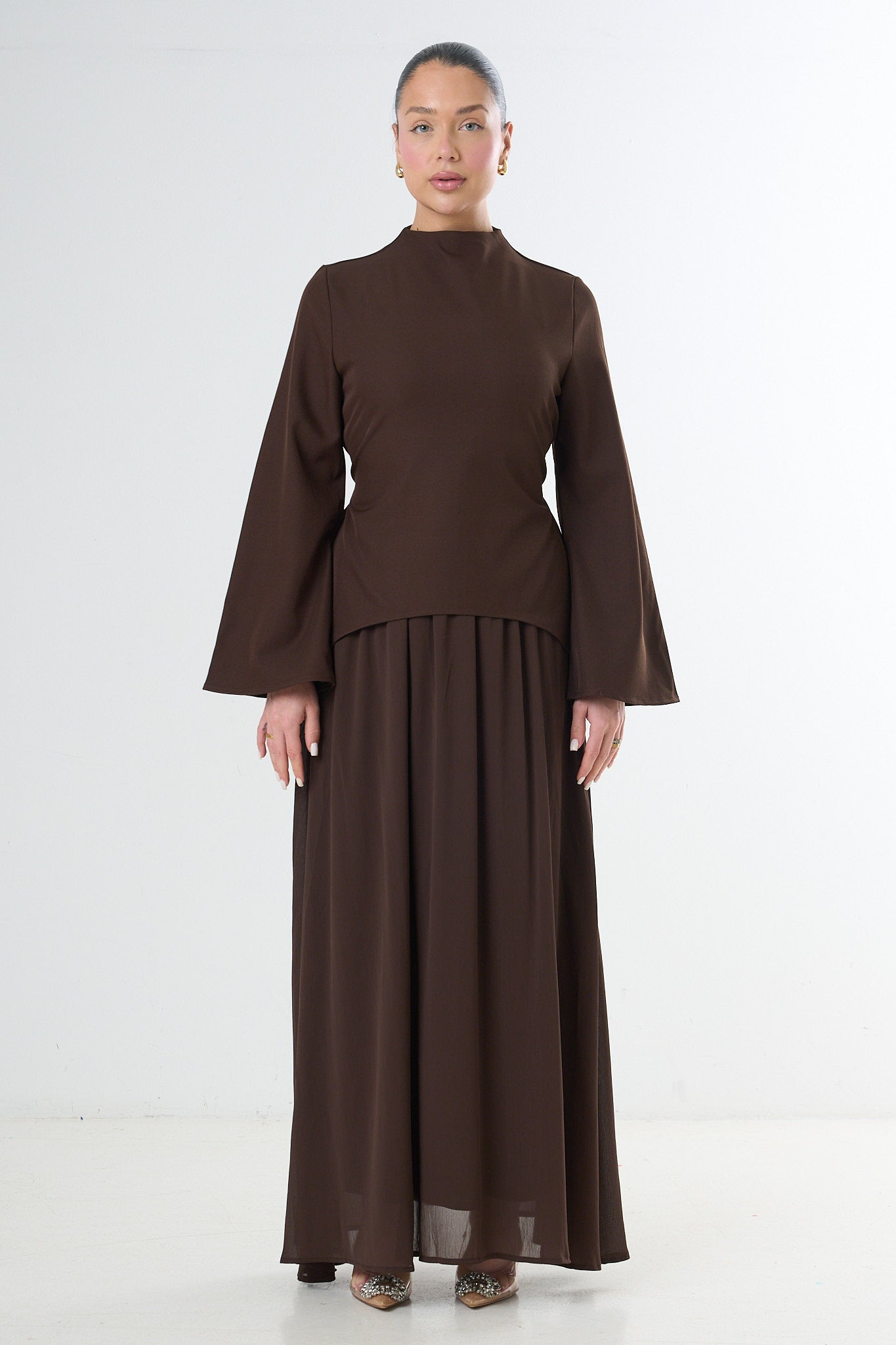The top includes a high neckline and wide flared sleeves for a refined, sculpted look. The maxi skirt drapes beautifully with a soft, fluid movement, creating a timeless and modest aesthetic suitable for everyday wear, work, events, or elevated evenings.