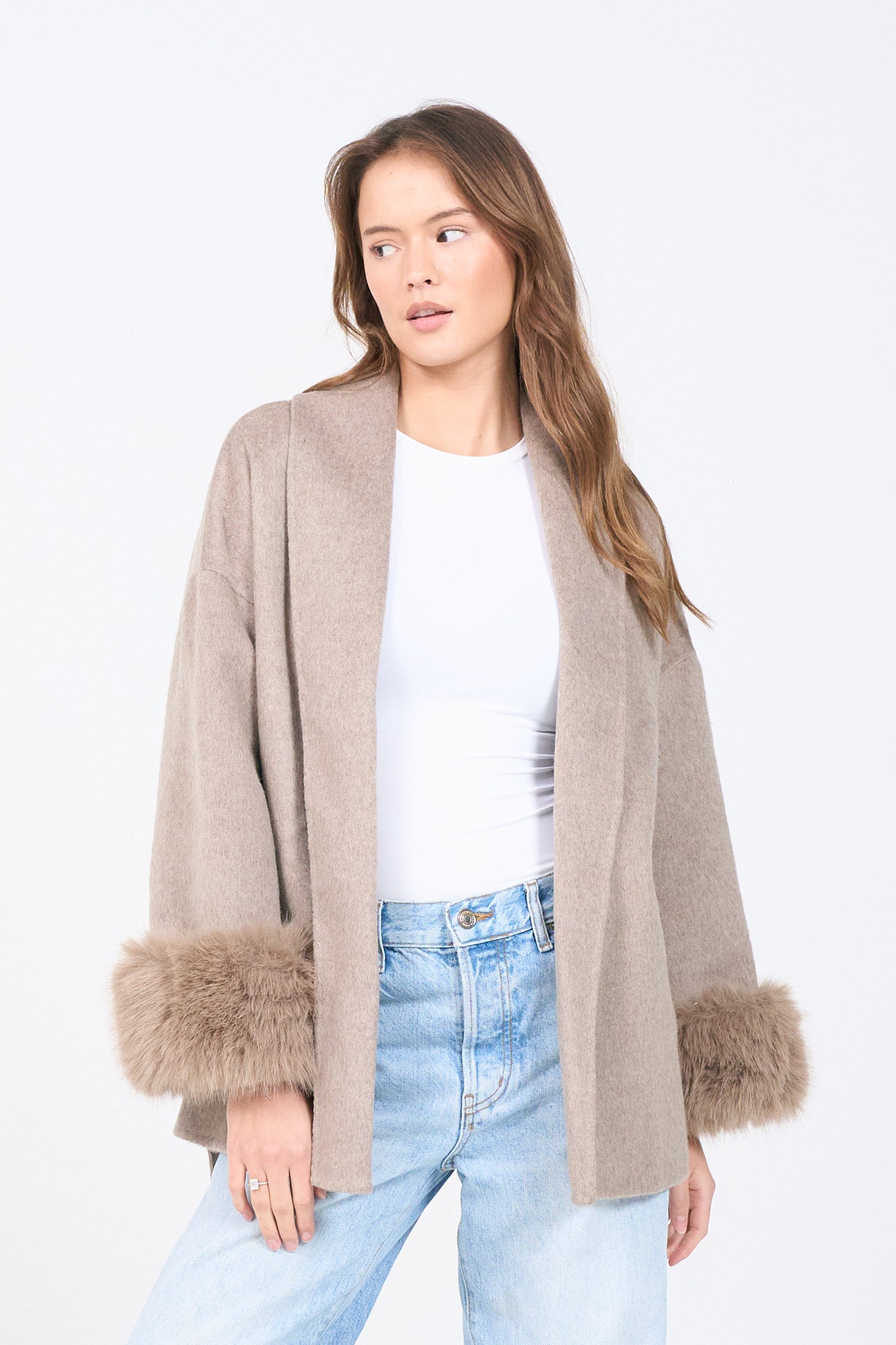 Experience timeless elegance with The Taupe Luxe Coat — a short wool coat that perfectly blends luxury and comfort. Crafted from 100% premium wool and finished with detachable fox fur cuffs, this piece effortlessly transitions from minimal chic to statement luxury.