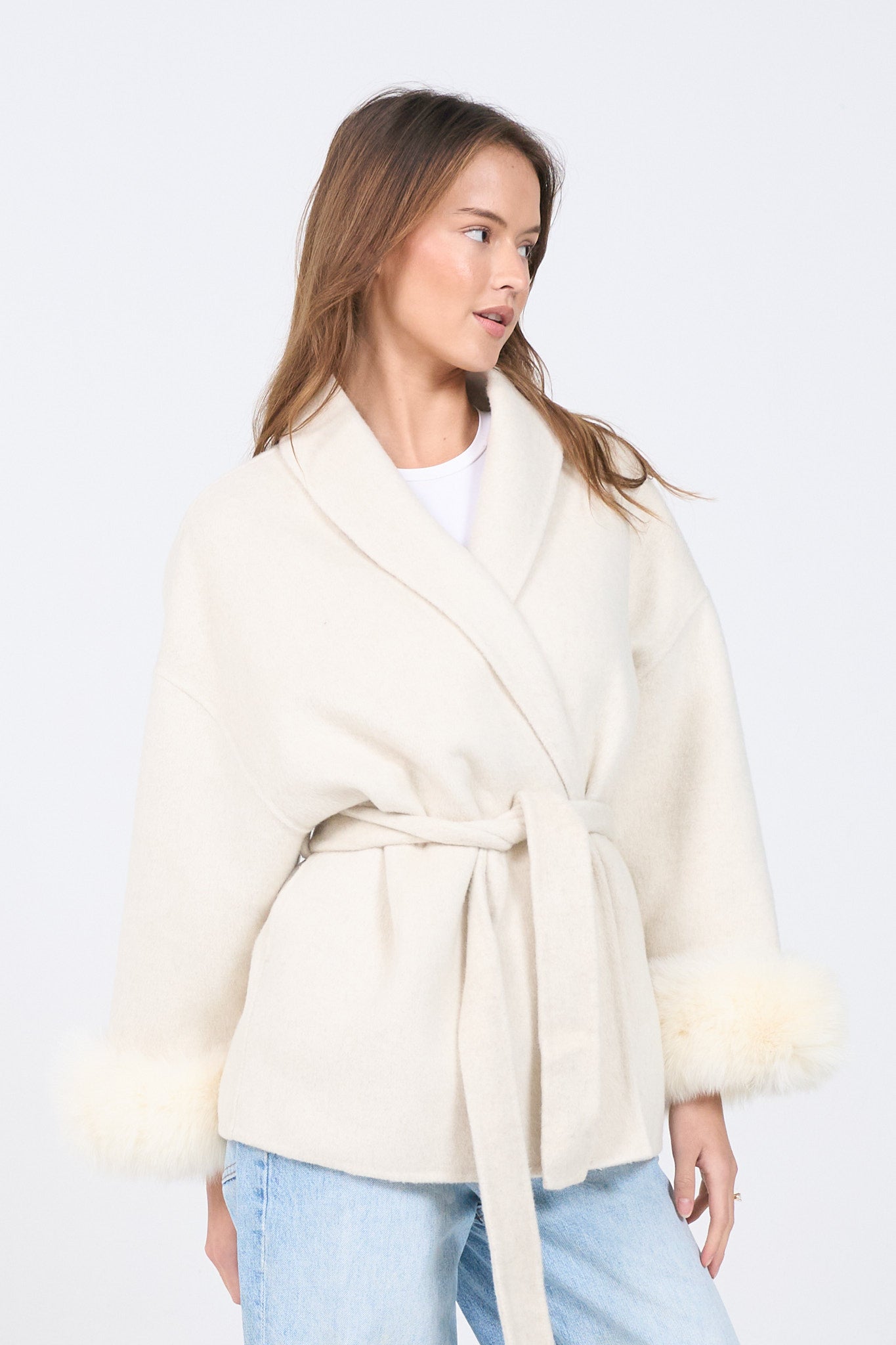 Experience timeless elegance with The Taupe Luxe Coat — a short wool coat that perfectly blends luxury and comfort. Crafted from 100% premium wool and finished with detachable fox fur cuffs, this piece effortlessly transitions from minimal chic to statement luxury.