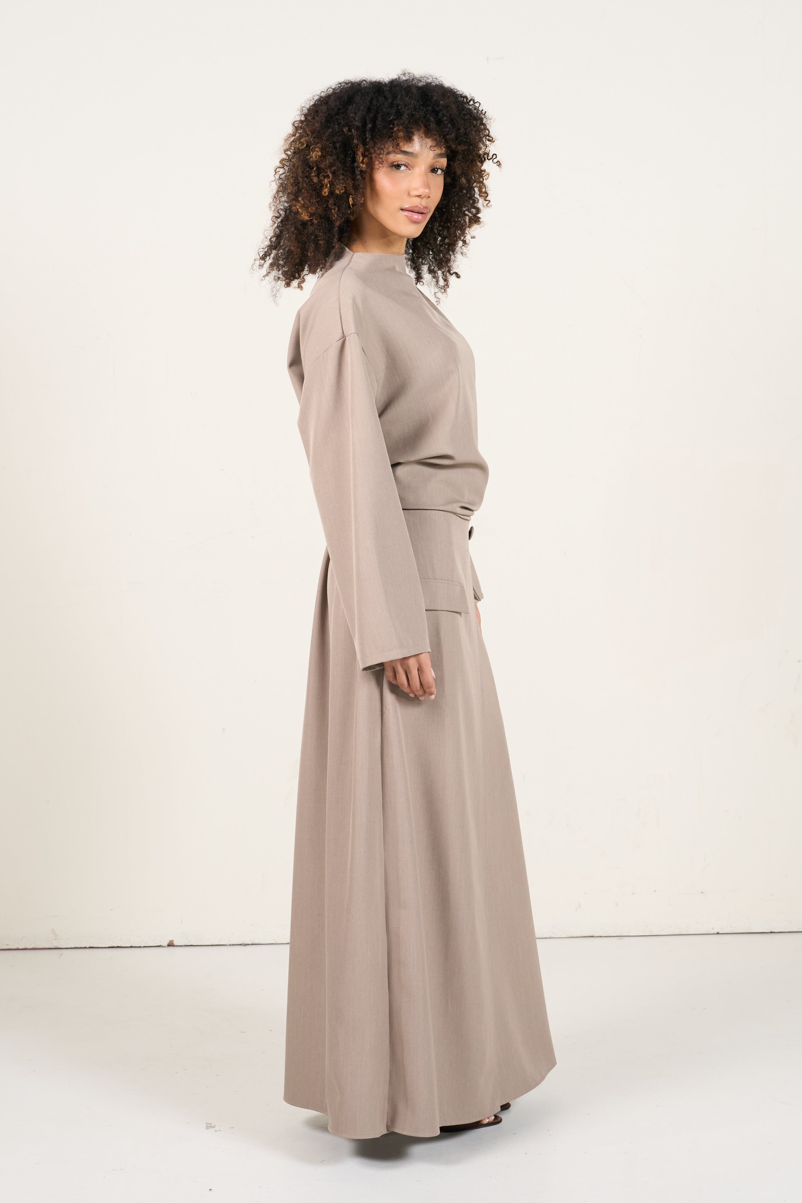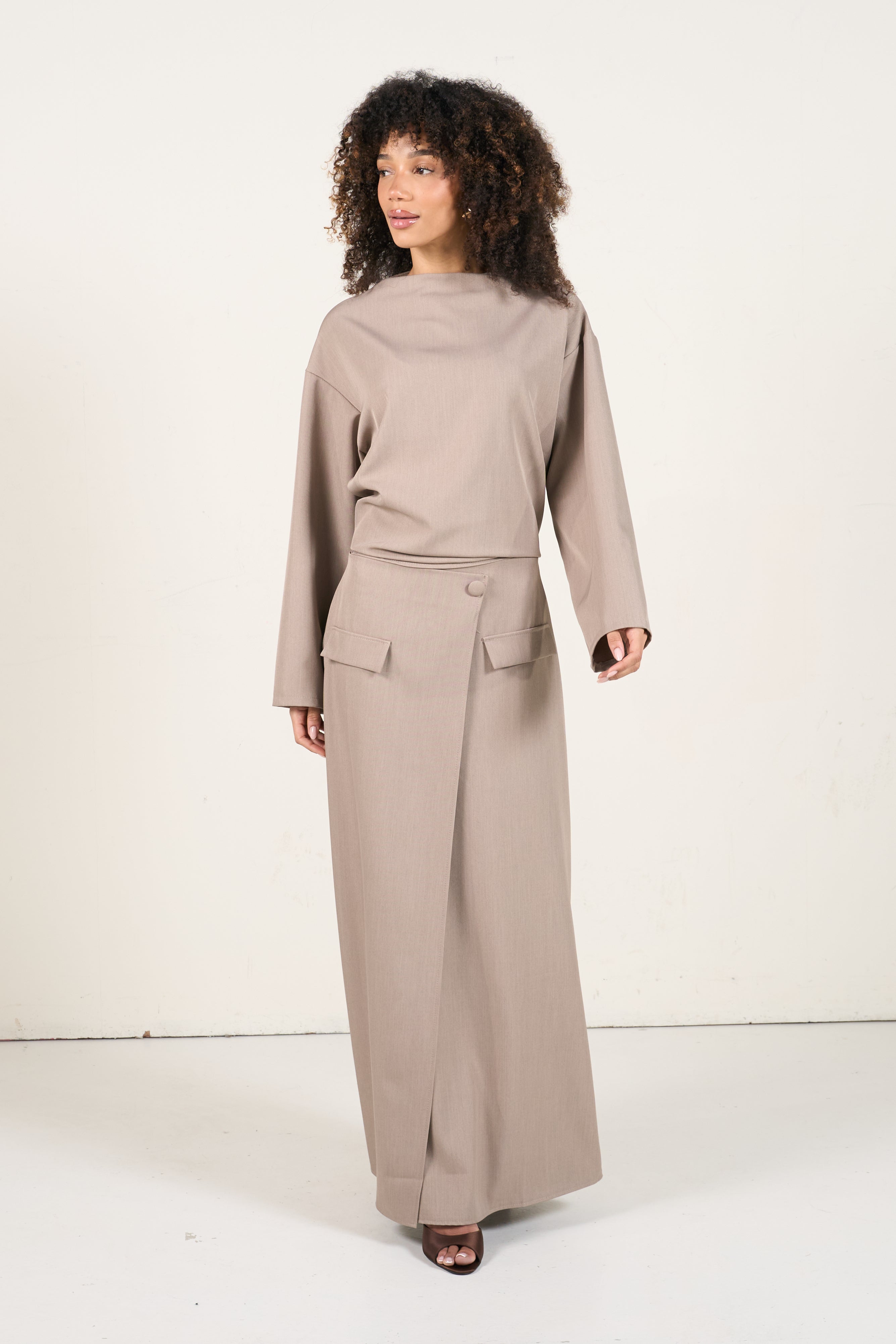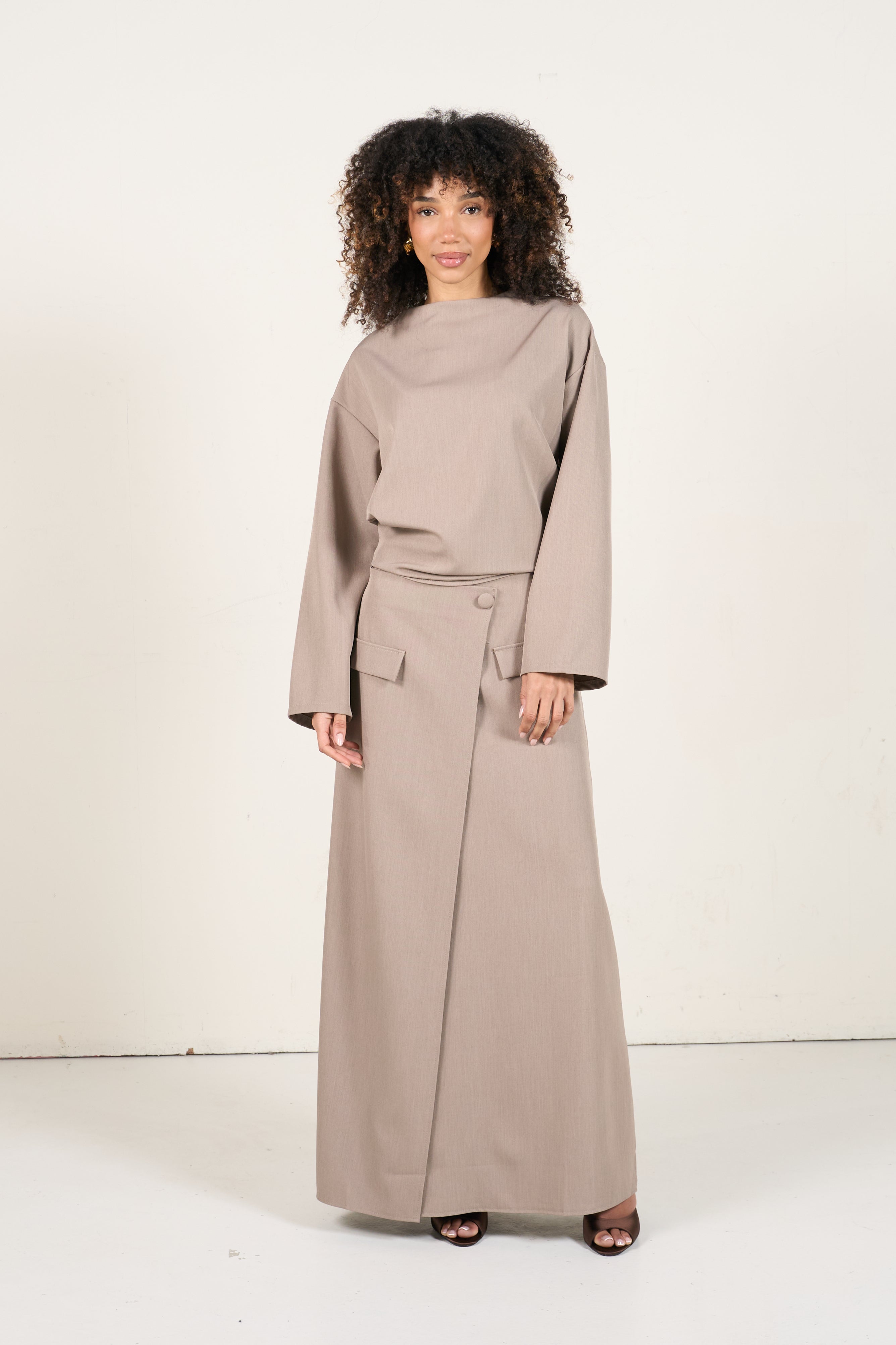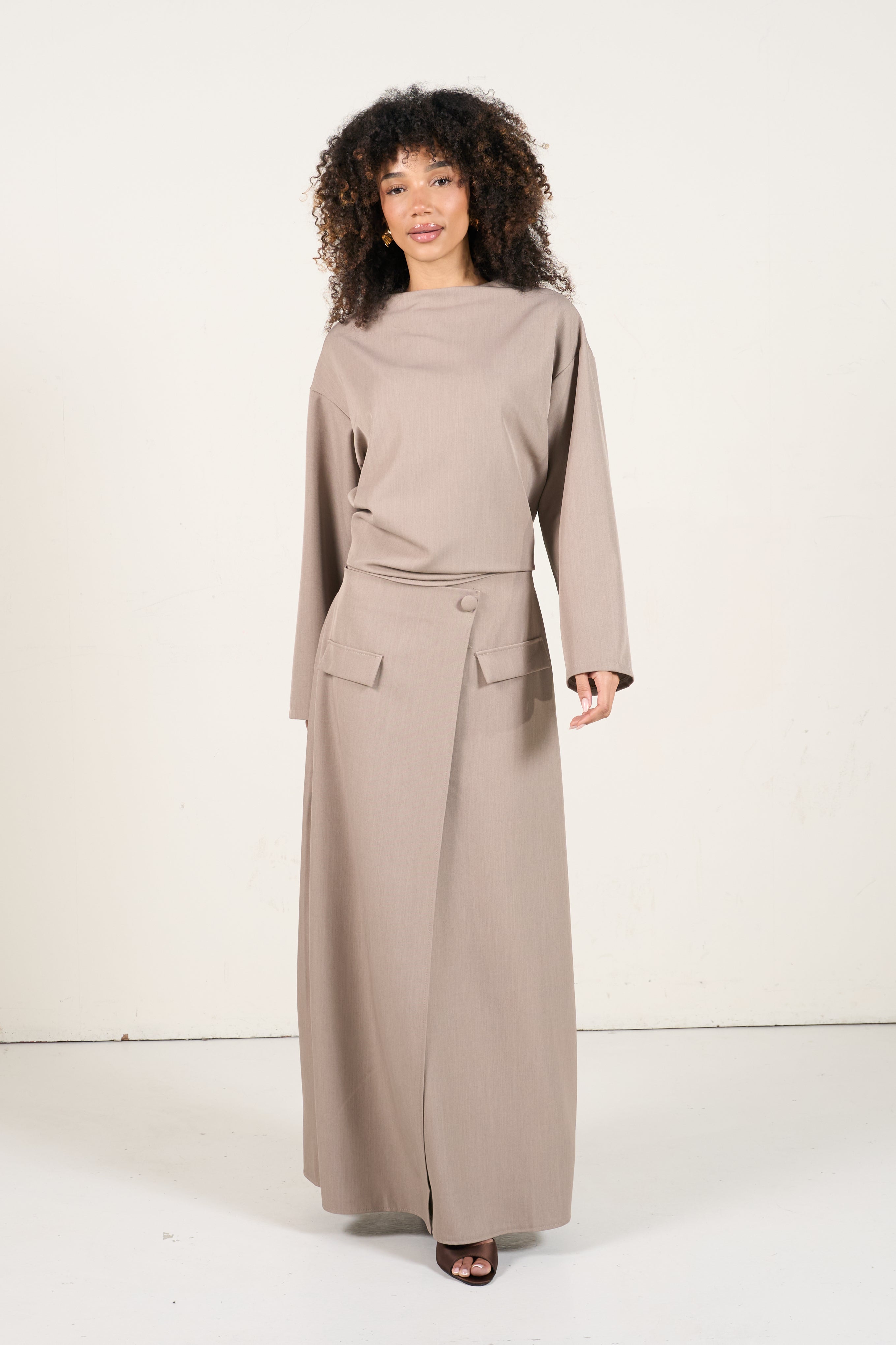 This taupe two-piece wrap skirt set features a minimalist top with wide sleeves and a flowing maxi wrap skirt. Designed for an elegant and modern silhouette, this co-ord set is suitable for formal occasions, workwear and modest fashion styling.
